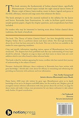 This book contains the fundamentals of Indian classical dance, specifically Bharatanatyam. Covered topics include the eight classical dances forms of Bharat, origin of dance, hasta mudras, music in dance, legends and gurus in the field, abhinaya, exercise and yoga asana that enhances the dance.